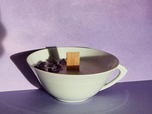 Bougie parfumée dans une tasse en porcelaine, au doux arôme de lilas, sublimée par des améthystes décoratives et dotée d’une mèche en bois. Cette bougie apporte une ambiance apaisante et élégante, parfaite pour transformer votre espace en un véritable havre de sérénité.
